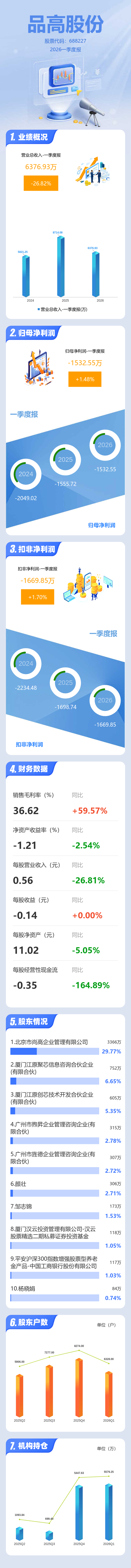 证券之星消息,品高股份2026年一季报显示,一季度公司主营收入6376.93万元,同比下降26.82%;归母净利润-1532.55万元,同比上升1.49%;扣非净利润-1669.85万元,同比上升1.7%;负债率32.62%,投资收益49.9万元,财务费用110.89万元,毛利率36.62%。