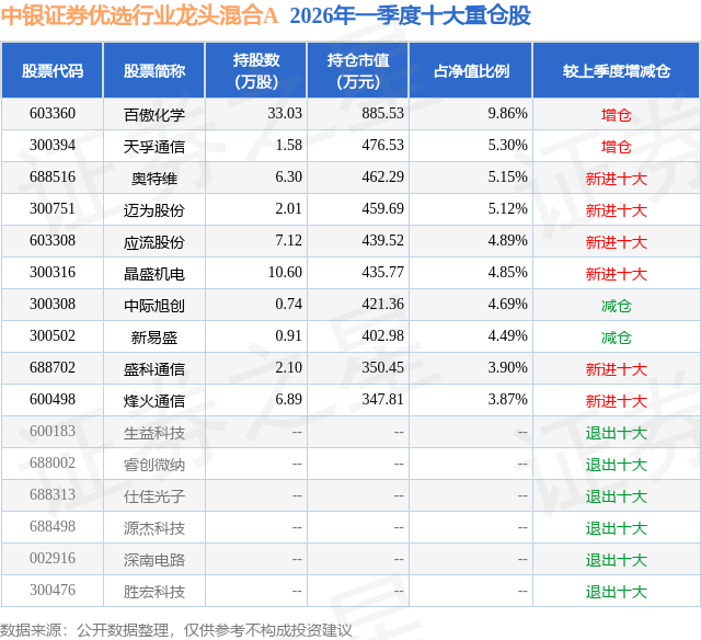根据2026基金Q1季报公募基金重仓股数据,重仓该股的公募基金共1家,其中持有数量最多的公募基金为中银证券的中银证券优选行业龙头混合A。中银证券优选行业龙头混合A目前规模为0.63亿元,最新净值0.7497(4月27日),较上一交易日上涨0.39%,近一年上涨88.41%。该公募基金现任基金经理为宋方云。