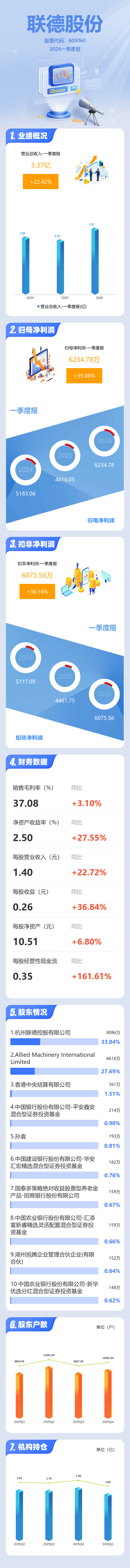 证券之星消息,联德股份2026年一季报显示,一季度公司主营收入3.37亿元,同比上升22.42%;归母净利润6234.78万元,同比上升35.07%;扣非净利润6075.56万元,同比上升36.17%;负债率16.71%,投资收益-24.57万元,财务费用466.21万元,毛利率37.08%。