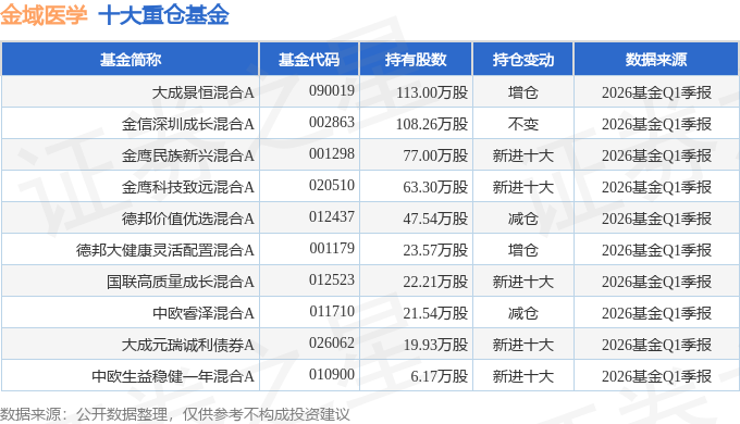 持有金域医学最多的基金为大成景恒混合A,目前规模为6.24亿元,最新净值3.7687(4月24日),较上一交易日上涨0.32%,近一年上涨41.52%。该基金现任基金经理为苏秉毅。