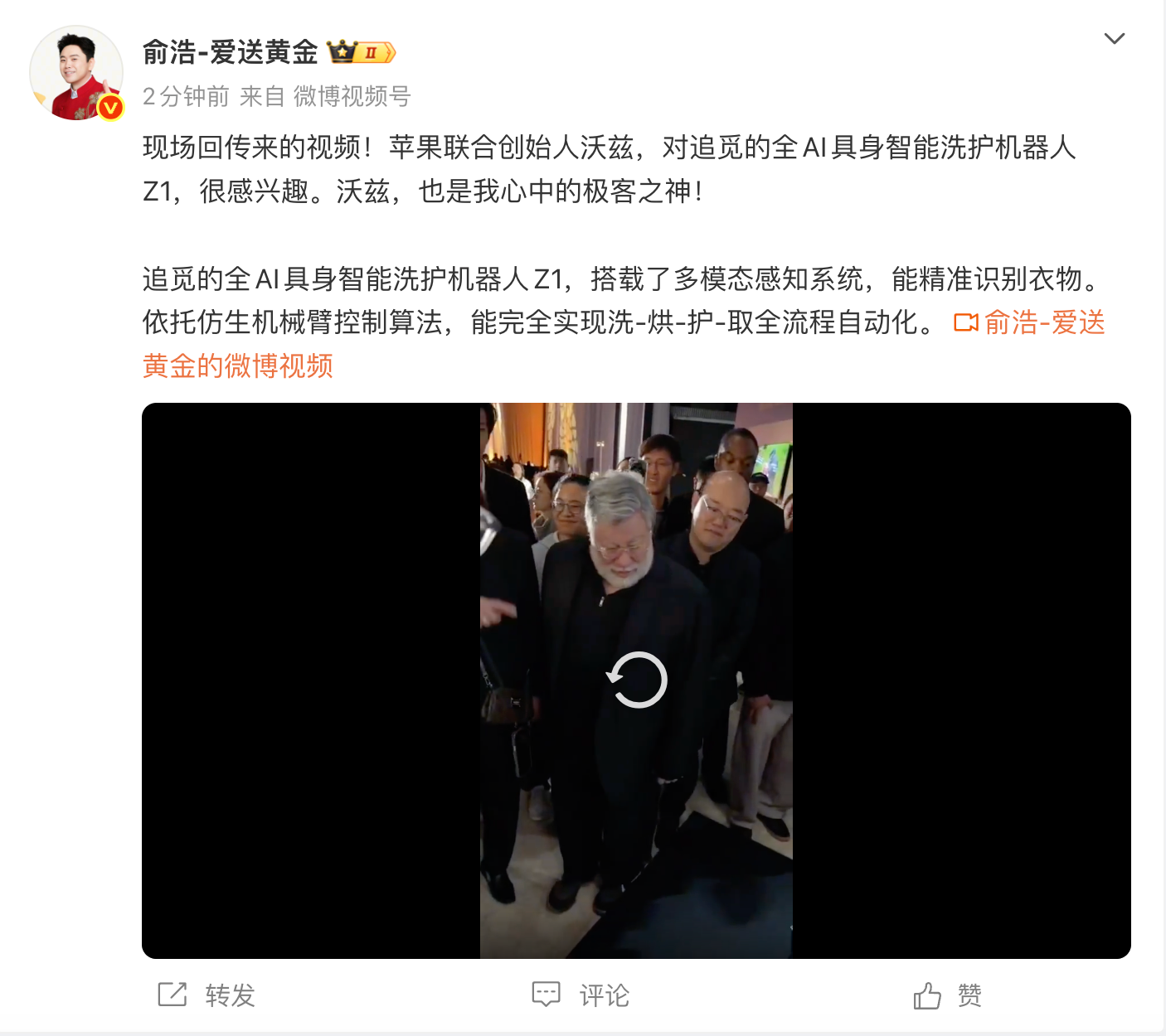 凤凰网科技讯 4月30日,追觅科技创始人兼CEO俞浩发文表示,苹果联合创始人史蒂夫·沃兹尼亚克对追觅全AI具身智能洗护机器人Z1,很感兴趣。根据介绍,追觅智能洗护机器人Z1搭载了多模态感知系统,能精准识别衣物。依托仿生机械臂控制算法,能完全实现洗-烘-护-取全流程自动化。
