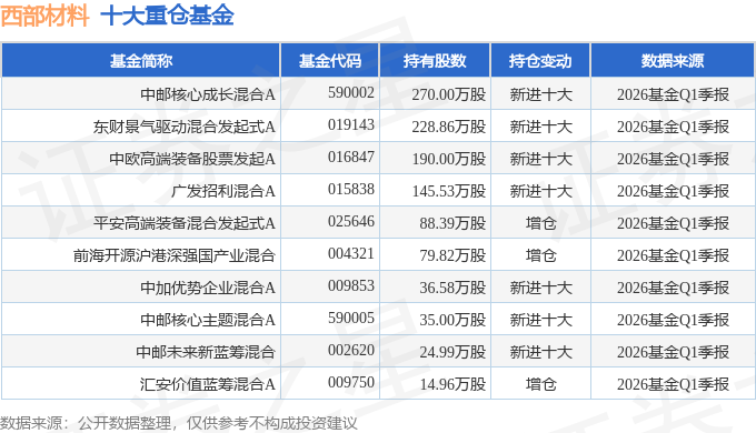 持有西部材料最多的基金为中邮核心成长混合A,目前规模为23.1亿元,最新净值0.5847(4月28日),较上一交易日上涨0.98%,近一年上涨8.46%。该基金现任基金经理为陈梁。