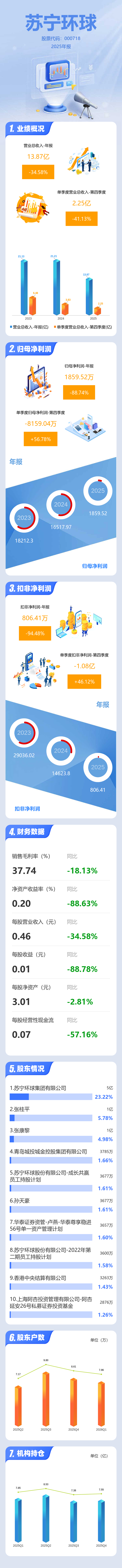 证券之星消息,苏宁环球2025年年报显示,当年度公司主营收入13.87亿元,同比下降34.59%;归母净利润1859.52万元,同比下降88.74%;扣非净利润806.41万元,同比下降94.49%;其中2025年第四季度,公司单季度主营收入2.25亿元,同比下降41.13%;单季度归母净利润-8159.04万元,同比上升56.79%;单季度扣非净利润-1.08亿元,同比上升46.12%;负债率29.67%,投资收益-1627.72万元,财务费用6905.81万元,毛利率37.74%。