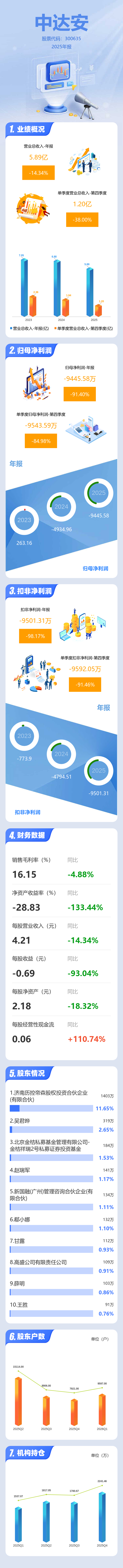 证券之星消息,中达安2025年年报显示,当年度公司主营收入5.89亿元,同比下降14.35%;归母净利润-9445.58万元,同比下降91.4%;扣非净利润-9501.31万元,同比下降98.17%;其中2025年第四季度,公司单季度主营收入1.2亿元,同比下降38.01%;单季度归母净利润-9543.59万元,同比下降84.98%;单季度扣非净利润-9592.05万元,同比下降91.46%;负债率72.65%,投资收益463.02万元,财务费用1820.38万元,毛利率16.15%。
