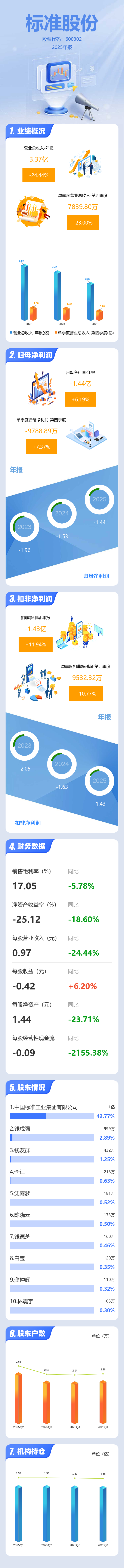证券之星消息,标准股份2025年年报显示,当年度公司主营收入3.37亿元,同比下降24.45%;归母净利润-1.44亿元,同比上升6.19%;扣非净利润-1.43亿元,同比上升11.94%;其中2025年第四季度,公司单季度主营收入7839.8万元,同比下降23.0%;单季度归母净利润-9788.89万元,同比上升7.37%;单季度扣非净利润-9532.32万元,同比上升10.77%;负债率42.39%,投资收益100.28万元,财务费用-1375.56万元,毛利率17.05%。