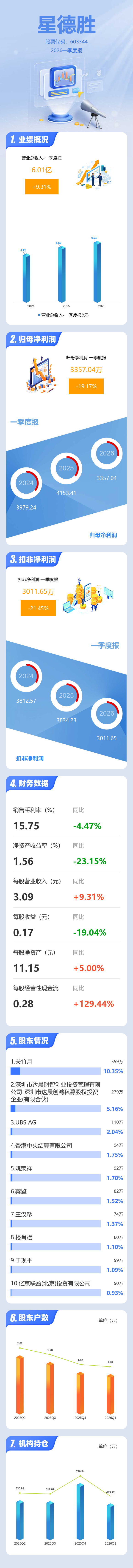 证券之星消息,星德胜2026年一季报显示,一季度公司主营收入6.01亿元,同比上升9.32%;归母净利润3357.04万元,同比下降19.17%;扣非净利润3011.65万元,同比下降21.45%;负债率33.41%,投资收益207.55万元,财务费用1298.99万元,毛利率15.75%。