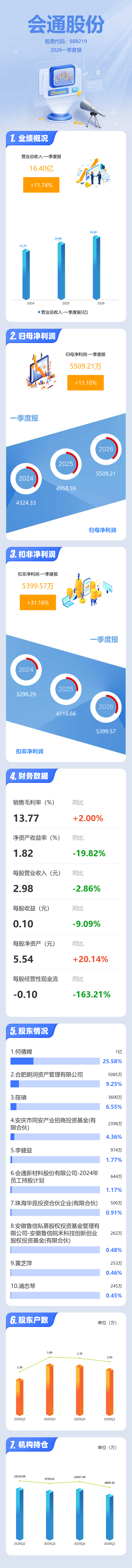 证券之星消息,会通股份2026年一季报显示,一季度公司主营收入16.4亿元,同比上升11.75%;归母净利润5509.21万元,同比上升11.1%;扣非净利润5399.57万元,同比上升31.16%;负债率57.03%,投资收益-141.79万元,财务费用752.34万元,毛利率13.77%。
