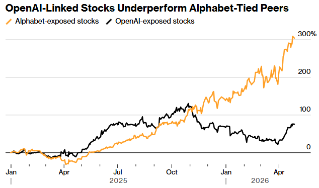 值得一提的是,谷歌对OpenAI的追赶也体现在与谷歌相关联的一系列股票上。数据显示,近几个月以来,一篮子与OpenAI相关的股票明显跑输同业。自2024年底以来,该组股票累计上涨约75%,而类似的一组与谷歌相关的股票同期内的涨幅则超过300%。