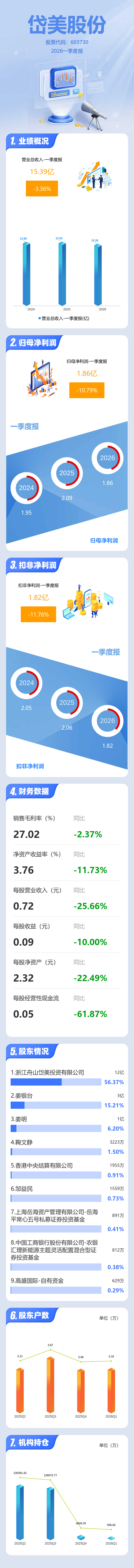 证券之星消息,岱美股份2026年一季报显示,一季度公司主营收入15.39亿元,同比下降3.36%;归母净利润1.86亿元,同比下降10.79%;扣非净利润1.82亿元,同比下降11.76%;负债率33.87%,投资收益62.75万元,财务费用4358.7万元,毛利率27.02%。