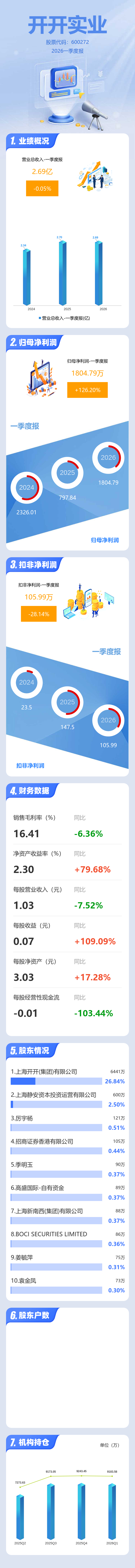 证券之星消息,开开实业2026年一季报显示,一季度公司主营收入2.69亿元,同比下降0.05%;归母净利润1804.79万元,同比上升126.21%;扣非净利润105.99万元,同比下降28.14%;负债率52.78%,投资收益1258.27万元,财务费用464.25万元,毛利率16.41%。