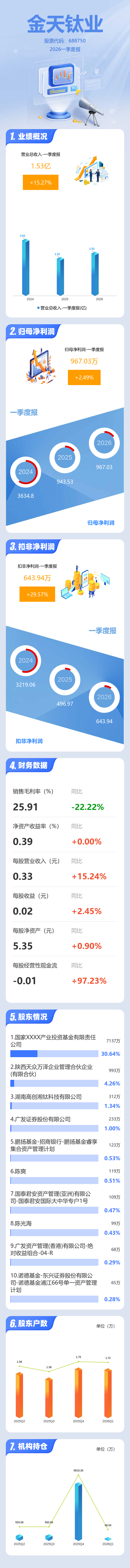 证券之星消息,金天钛业2026年一季报显示,一季度公司主营收入1.53亿元,同比上升15.27%;归母净利润967.03万元,同比上升2.49%;扣非净利润643.94万元,同比上升29.57%;负债率33.1%,投资收益394.62万元,财务费用183.91万元,毛利率25.91%。
