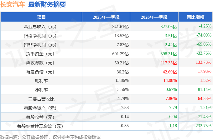 据证券之星公开数据整理,近期长安汽车(000625)发布2026年一季报。截至本报告期末,公司营业总收入327.06亿元,同比下降4.26%,归母净利润3.51亿元,同比下降74.09%。按单季度数据看,第一季度营业总收入327.06亿元,同比下降4.26%,第一季度归母净利润3.51亿元,同比下降74.09%。本报告期长安汽车应收账款上升,应收账款同比增幅达133.73%。