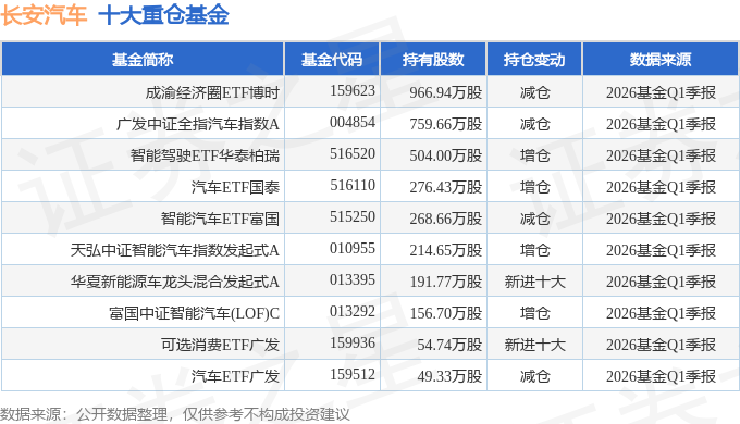 持有长安汽车最多的基金为成渝经济圈ETF博时,目前规模为31.22亿元,最新净值1.0473(4月28日),较上一交易日下跌0.93%,近一年上涨40.21%。该基金现任基金经理为尹浩。