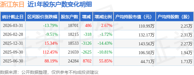 从股价来看,2026年2月28日至2026年3月31日,浙江东日区间跌幅为13.79%,在此期间股东户数增加486.0户,增幅为2.67%。