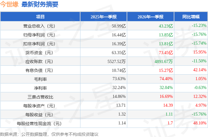 据证券之星公开数据整理,近期今世缘(603369)发布2026年一季报。根据财报显示,今世缘净利润同比下降15.76%。截至本报告期末,公司营业总收入43.23亿元,同比下降15.23%,归母净利润13.85亿元,同比下降15.76%。按单季度数据看,第一季度营业总收入43.23亿元,同比下降15.23%,第一季度归母净利润13.85亿元,同比下降15.76%。