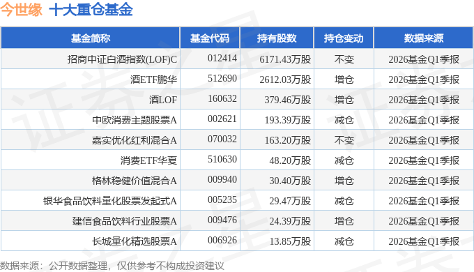 持有今世缘最多的基金为招商中证白酒指数(LOF)C,目前规模为143.83亿元,最新净值0.6289(4月29日),较上一交易日上涨1.0%,近一年下跌19.58%。该基金现任基金经理为侯昊。