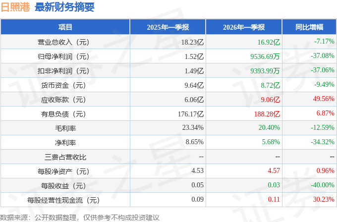 据证券之星公开数据整理,近期日照港(600017)发布2026年一季报。截至本报告期末,公司营业总收入16.92亿元,同比下降7.17%,归母净利润9536.69万元,同比下降37.08%。按单季度数据看,第一季度营业总收入16.92亿元,同比下降7.17%,第一季度归母净利润9536.69万元,同比下降37.08%。本报告期日照港应收账款上升,应收账款同比增幅达49.56%。