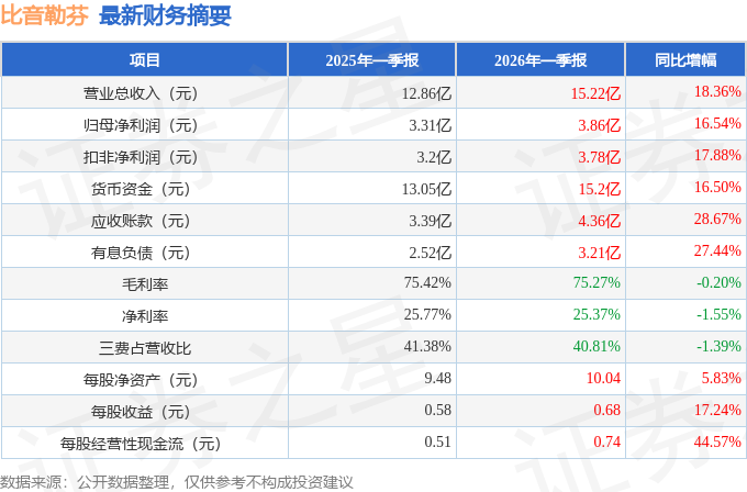 据证券之星公开数据整理,近期比音勒芬(002832)发布2026年一季报。截至本报告期末,公司营业总收入15.22亿元,同比上升18.36%,归母净利润3.86亿元,同比上升16.54%。按单季度数据看,第一季度营业总收入15.22亿元,同比上升18.36%,第一季度归母净利润3.86亿元,同比上升16.54%。本报告期比音勒芬公司应收账款体量较大,当期应收账款占最新年报归母净利润比达79.23%。