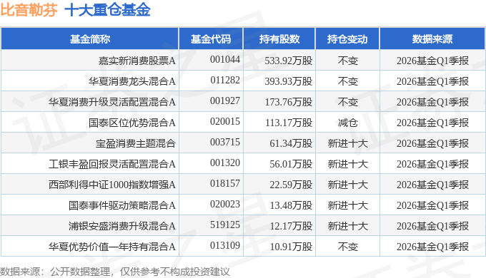 持有比音勒芬最多的基金为嘉实新消费股票A,目前规模为11.64亿元,最新净值2.52(4月29日),较上一交易日上涨3.11%,近一年上涨0.0%。该基金现任基金经理为谭丽。