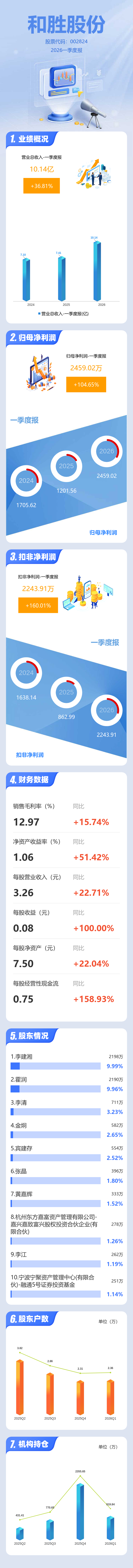 证券之星消息,和胜股份2026年一季报显示,一季度公司主营收入10.14亿元,同比上升36.82%;归母净利润2459.02万元,同比上升104.65%;扣非净利润2243.91万元,同比上升160.02%;负债率57.06%,投资收益-99.19万元,财务费用768.23万元,毛利率12.97%。