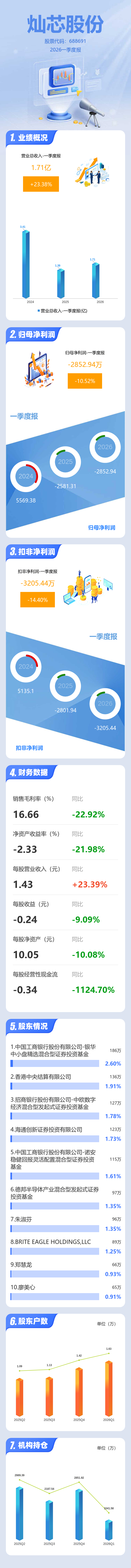 证券之星消息,灿芯股份2026年一季报显示,一季度公司主营收入1.71亿元,同比上升23.39%;归母净利润-2852.94万元,同比下降10.52%;扣非净利润-3205.44万元,同比下降14.4%;负债率24.37%,投资收益310.1万元,财务费用-254.12万元,毛利率16.66%。