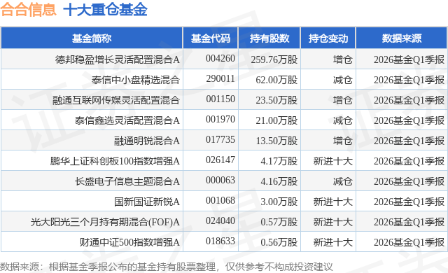 根据2026基金Q1季报公募基金重仓股数据,重仓该股的公募基金共12家,其中持有数量最多的公募基金为德邦基金的德邦稳盈增长灵活配置混合A。德邦稳盈增长灵活配置混合A目前规模为2.67亿元,最新净值1.0117(4月28日),较上一交易日下跌3.06%,近一年上涨10.8%。该公募基金现任基金经理为雷涛 陆阳。雷涛在任的基金产品包括:德邦半导体产业混合发起式A,管理时间为2021年12月28日至今,期间收益率为147.71%;德邦福鑫灵活配置混合A,管理时间为2023年10月13日至今,期间收益率为5.4%;德邦鑫星价值灵活配置混合A,管理时间为2024年1月30日至今,期间收益率为418.15%。陆阳在任的基金产品包括:德邦鑫星价值灵活配置混合A,管理时间为2024年1月30日至今,期间收益率为418.15%;德邦高端装备混合发起式A,管理时间为2025年3月14日至今,期间收益率为2.51%。