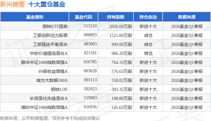 持有新兴铸管最多的基金为钢铁ETF国泰,目前规模为31.98亿元,最新净值1.4304(4月28日),较上一交易日下跌0.09%,近一年上涨22.48%。该基金现任基金经理为吴中昊。