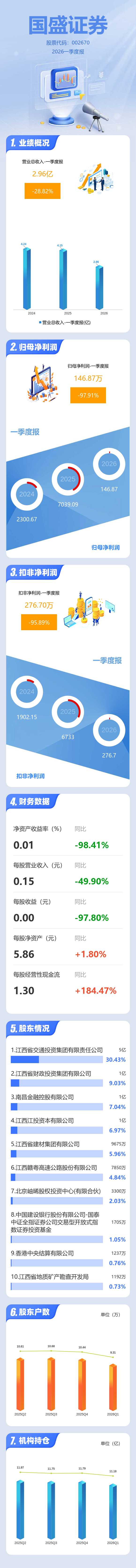 证券之星消息,国盛证券2026年一季报显示,一季度公司主营收入2.96亿元,同比下降28.82%;归母净利润146.87万元,同比下降97.91%;扣非净利润276.7万元,同比下降95.89%;负债率76.71%,投资收益941.21万元。