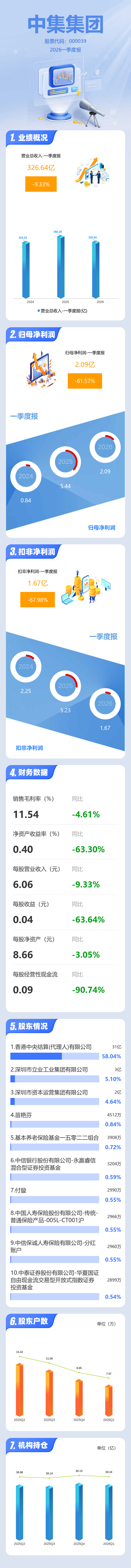 证券之星消息,中集集团2026年一季报显示,一季度公司主营收入326.64亿元,同比下降9.33%;归母净利润2.09亿元,同比下降61.57%;扣非净利润1.67亿元,同比下降67.99%;负债率59.4%,投资收益9758.6万元,财务费用4.5亿元,毛利率11.54%。