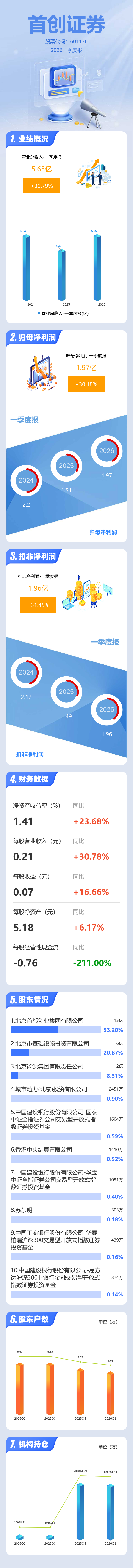 证券之星消息,首创证券2026年一季报显示,一季度公司主营收入5.65亿元,同比上升30.8%;归母净利润1.97亿元,同比上升30.19%;扣非净利润1.96亿元,同比上升31.46%;负债率72.39%,投资收益3.36亿元。
