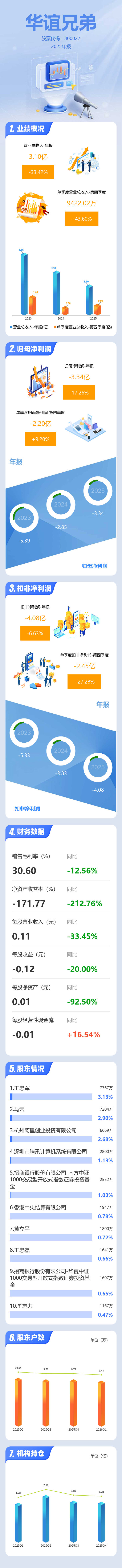 证券之星消息,华谊兄弟2025年年报显示,当年度公司主营收入3.1亿元,同比下降33.43%;归母净利润-3.34亿元,同比下降17.26%;扣非净利润-4.08亿元,同比下降6.63%;其中2025年第四季度,公司单季度主营收入9422.02万元,同比上升43.6%;单季度归母净利润-2.2亿元,同比上升9.21%;单季度扣非净利润-2.45亿元,同比上升27.29%;负债率96.26%,投资收益5449.58万元,财务费用6286.59万元,毛利率30.6%。
