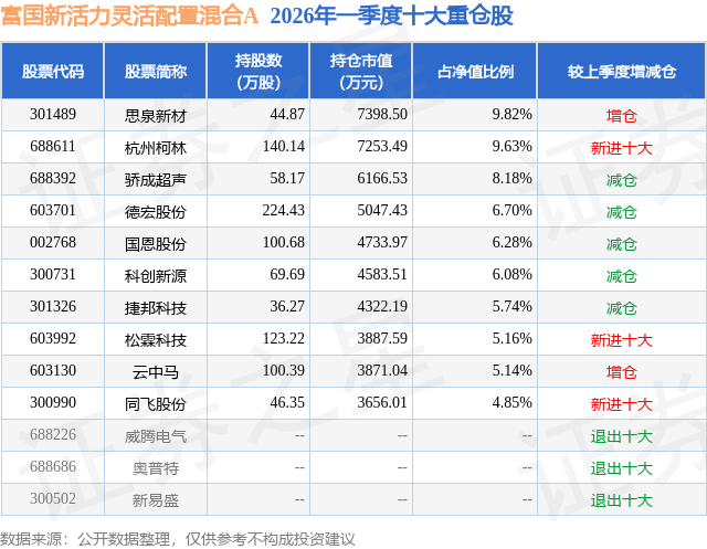 根据2026基金Q1季报公募基金重仓股数据,重仓该股的公募基金共3家,其中持有数量最多的公募基金为富国基金的富国新活力灵活配置混合A。富国新活力灵活配置混合A目前规模为3.31亿元,最新净值3.8932(4月28日),较上一交易日下跌1.63%,近一年上涨48.47%。该公募基金现任基金经理为吴栋栋。吴栋栋在任的基金产品包括:富国质量成长6个月持有混合A,管理时间为2022年2月28日至今,期间收益率为67.19%;富国核心优势混合发起式A,管理时间为2023年12月1日至今,期间收益率为105.11%;富国核心动力混合A,管理时间为2026年3月18日至今,期间收益率为9.72%。