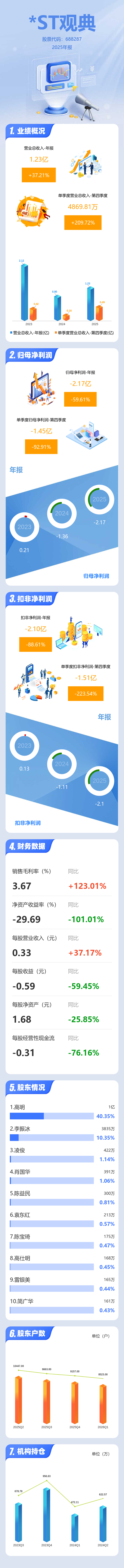 证券之星消息,*ST观典2025年年报显示,当年度公司主营收入1.23亿元,同比上升37.21%;归母净利润-2.17亿元,同比下降59.62%;扣非净利润-2.1亿元,同比下降88.61%;其中2025年第四季度,公司单季度主营收入4869.81万元,同比上升209.72%;单季度归母净利润-1.45亿元,同比下降92.91%;单季度扣非净利润-1.51亿元,同比下降223.55%;负债率12.61%,投资收益-33.3万元,财务费用-288.02万元,毛利率3.67%。