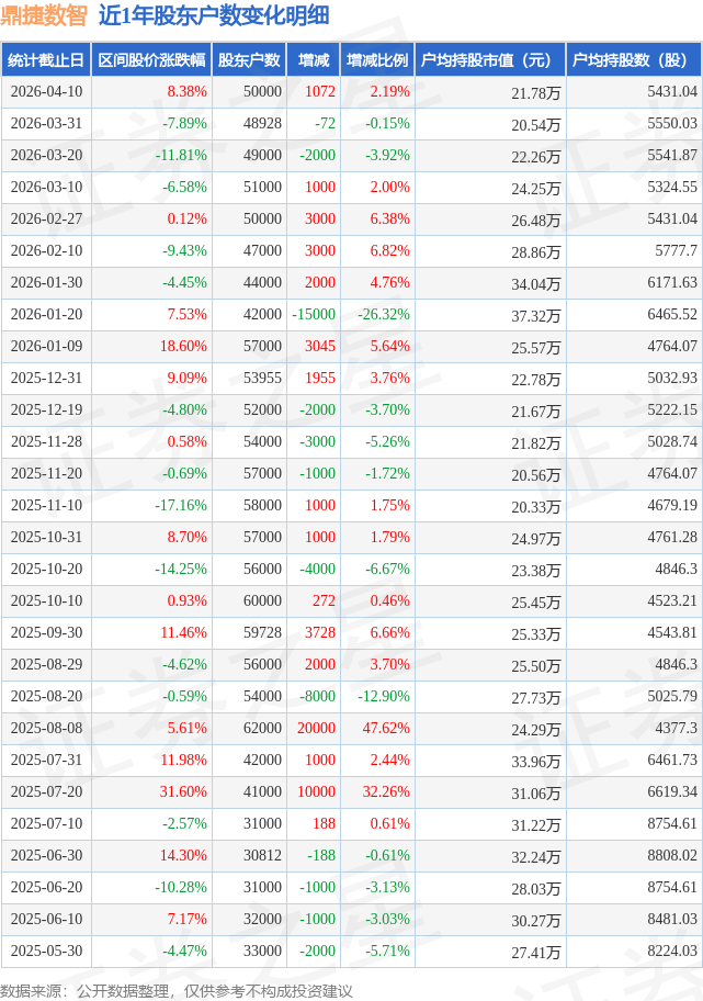 证券之星消息,近日鼎捷数智披露,截至2026年4月10日公司股东户数为5.0万户,较3月31日增加1072.0户,增幅为2.19%。户均持股数量由上期的5550.0股减少至5431.0股,户均持股市值为21.78万元。
