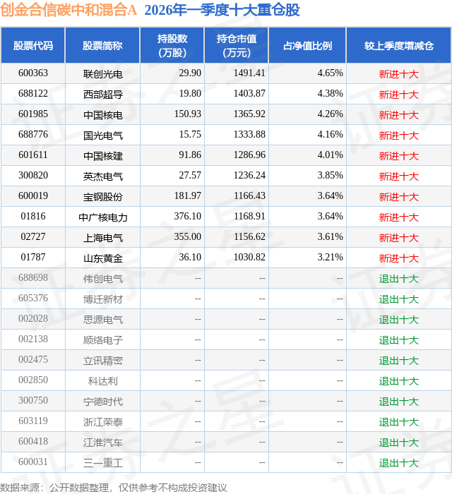 根据2026基金Q1季报公募基金重仓股数据,重仓该股的公募基金共1家,其中持有数量最多的公募基金为创金合信基金的创金合信碳中和混合A。创金合信碳中和混合A目前规模为1.93亿元,最新净值0.5636(4月29日),较上一交易日上涨0.21%,近一年上涨42.61%。该公募基金现任基金经理为黄超。黄超在任的基金产品包括:创金合信资源股票发起式A,管理时间为2023年5月12日至今,期间收益率为88.87%;