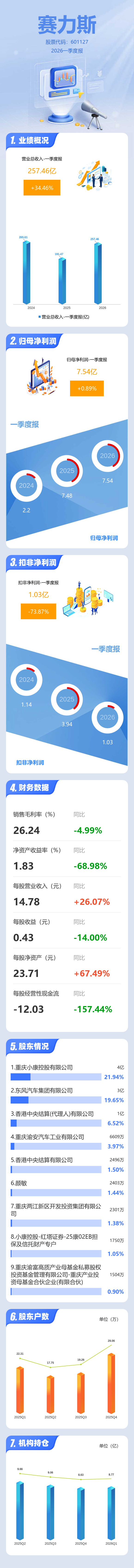 证券之星消息,赛力斯2026年一季报显示,一季度公司主营收入257.46亿元,同比上升34.46%;归母净利润7.54亿元,同比上升0.89%;扣非净利润1.03亿元,同比下降73.87%;负债率65.92%,投资收益4186.52万元,财务费用9581.38万元,毛利率26.24%。