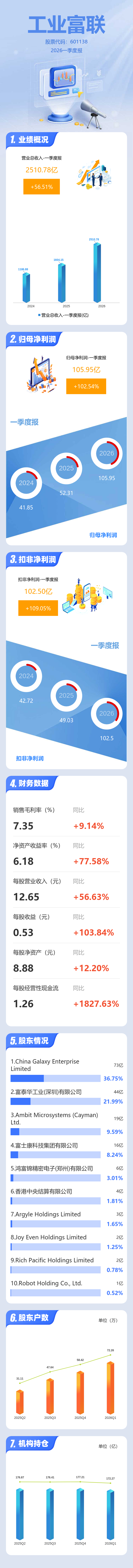 证券之星消息,工业富联2026年一季报显示,一季度公司主营收入2510.78亿元,同比上升56.52%;归母净利润105.95亿元,同比上升102.55%;扣非净利润102.5亿元,同比上升109.05%;负债率61.38%,投资收益-1.05亿元,财务费用8.38亿元,毛利率7.35%。