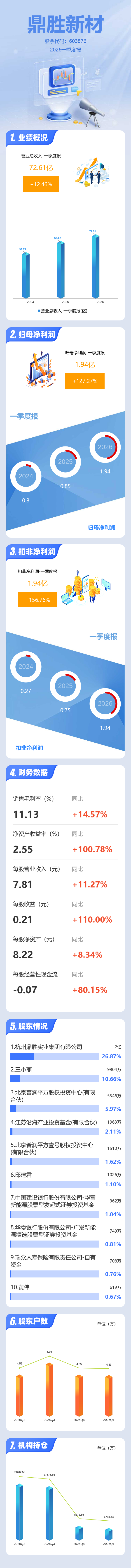 证券之星消息,鼎胜新材2026年一季报显示,一季度公司主营收入72.61亿元,同比上升12.46%;归母净利润1.94亿元,同比上升127.28%;扣非净利润1.94亿元,同比上升156.76%;负债率70.23%,投资收益-4334.73万元,财务费用7202.99万元,毛利率11.13%。