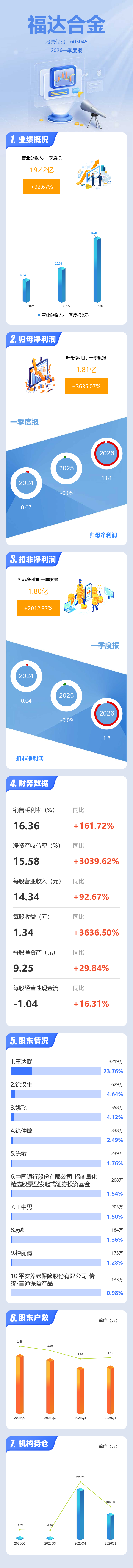 证券之星消息,福达合金2026年一季报显示,一季度公司主营收入19.42亿元,同比上升92.67%;归母净利润1.81亿元,同比上升3635.07%;扣非净利润1.8亿元,同比上升2012.38%;负债率66.21%,投资收益-0.02万元,财务费用2401.09万元,毛利率16.36%。