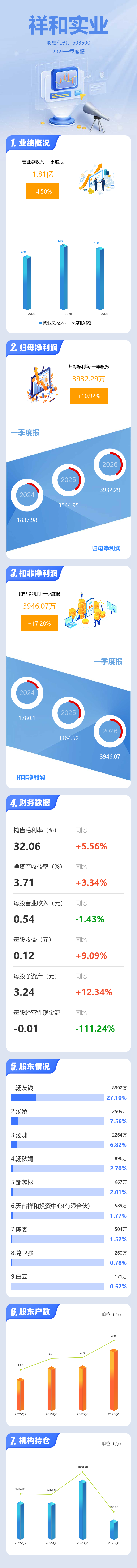 证券之星消息,祥和实业2026年一季报显示,一季度公司主营收入1.81亿元,同比下降4.58%;归母净利润3932.29万元,同比上升10.93%;扣非净利润3946.07万元,同比上升17.28%;负债率41.88%,投资收益440.75万元,财务费用92.82万元,毛利率32.06%。