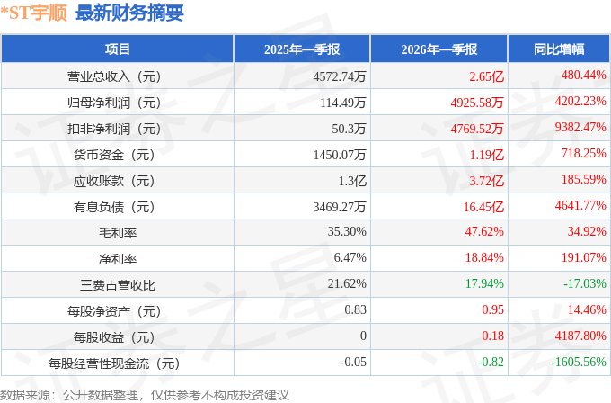 据证券之星公开数据整理,近期*ST宇顺(002289)发布2026年一季报。截至本报告期末,公司营业总收入2.65亿元,同比上升480.44%,归母净利润4925.58万元,同比上升4202.23%。按单季度数据看,第一季度营业总收入2.65亿元,同比上升480.44%,第一季度归母净利润4925.58万元,同比上升4202.23%。本报告期*ST宇顺短期债务压力上升,流动比率达0.23。