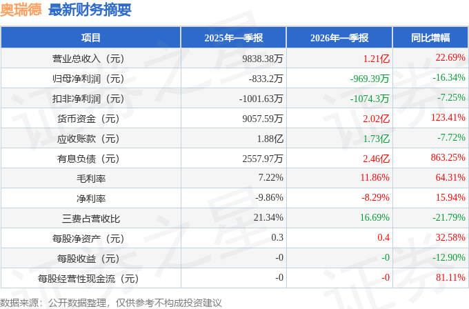 据证券之星公开数据整理,近期奥瑞德(600666)发布2026年一季报。截至本报告期末,公司营业总收入1.21亿元,同比上升22.69%,归母净利润-969.39万元,同比下降16.34%。按单季度数据看,第一季度营业总收入1.21亿元,同比上升22.69%,第一季度归母净利润-969.39万元,同比下降16.34%。本报告期奥瑞德盈利能力上升,毛利率同比增幅64.31%,净利率同比增幅15.94%。