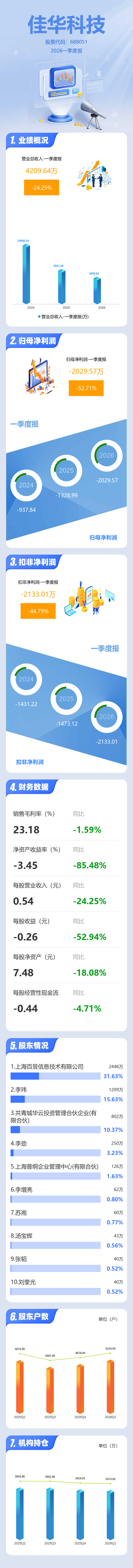 证券之星消息,佳华科技2026年一季报显示,一季度公司主营收入4209.64万元,同比下降24.25%;归母净利润-2029.57万元,同比下降52.72%;扣非净利润-2133.01万元,同比下降44.8%;负债率36.35%,投资收益0.39万元,财务费用16.61万元,毛利率23.18%。