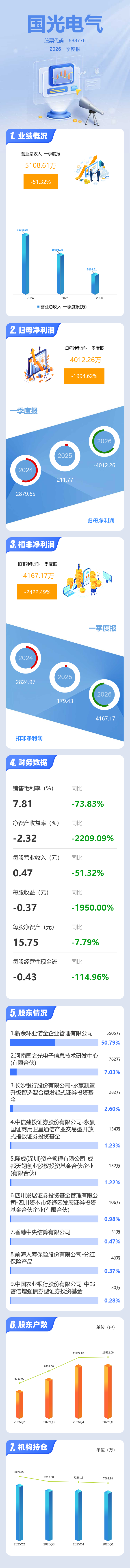 证券之星消息,国光电气2026年一季报显示,一季度公司主营收入5108.61万元,同比下降51.32%;归母净利润-4012.26万元,同比下降1994.63%;扣非净利润-4167.17万元,同比下降2422.49%;负债率25.65%,投资收益91.18万元,财务费用-47.96万元,毛利率7.81%。