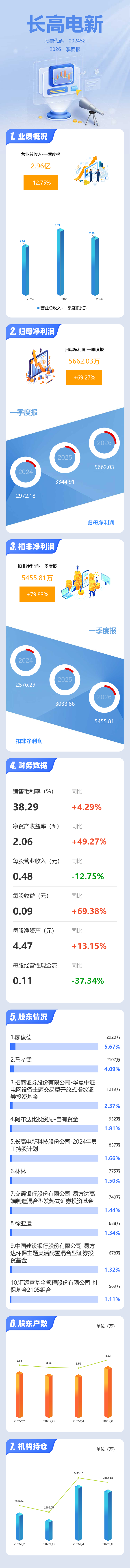证券之星消息,长高电新2026年一季报显示,一季度公司主营收入2.96亿元,同比下降12.76%;归母净利润5662.03万元,同比上升69.27%;扣非净利润5455.81万元,同比上升79.83%;负债率38.1%,投资收益363.89万元,财务费用-111.05万元,毛利率38.29%。