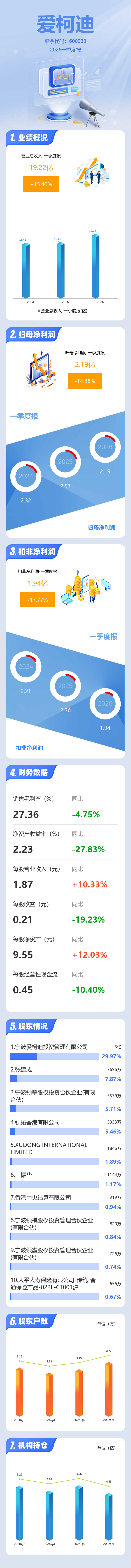 证券之星消息,爱柯迪2026年一季报显示,一季度公司主营收入19.22亿元,同比上升15.4%;归母净利润2.19亿元,同比下降14.89%;扣非净利润1.94亿元,同比下降17.78%;负债率40.94%,投资收益294.62万元,财务费用5039.21万元,毛利率27.36%。
