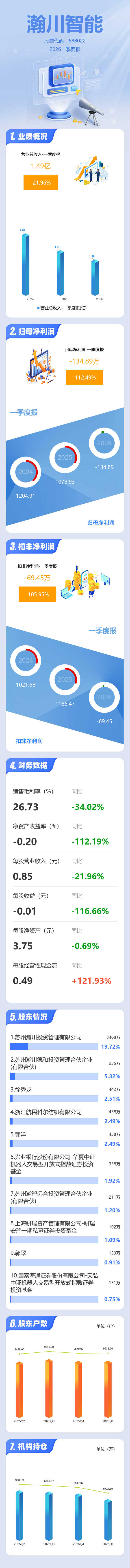 证券之星消息,瀚川智能2026年一季报显示,一季度公司主营收入1.49亿元,同比下降21.97%;归母净利润-134.89万元,同比下降112.49%;扣非净利润-69.45万元,同比下降105.95%;负债率71.84%,投资收益-244.19万元,财务费用1338.72万元,毛利率26.73%。