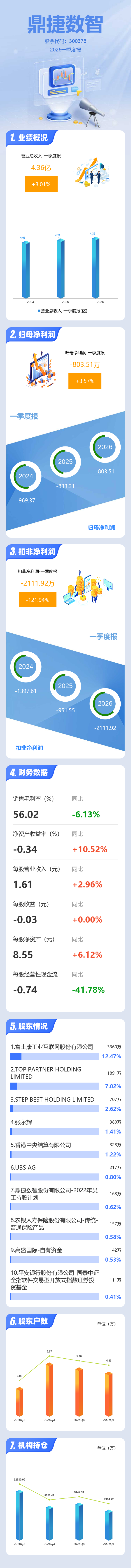 证券之星消息,鼎捷数智2026年一季报显示,一季度公司主营收入4.36亿元,同比上升3.02%;归母净利润-803.51万元,同比上升3.58%;扣非净利润-2111.92万元,同比下降121.95%;负债率45.01%,投资收益-76.92万元,财务费用616.7万元,毛利率56.02%。