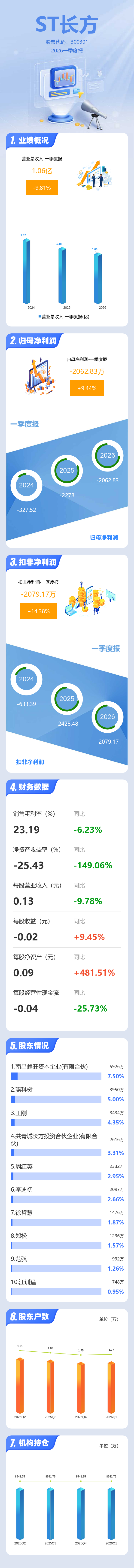 证券之星消息,ST长方2026年一季报显示,一季度公司主营收入1.06亿元,同比下降9.81%;归母净利润-2062.83万元,同比上升9.45%;扣非净利润-2079.17万元,同比上升14.38%;负债率91.03%,财务费用745.07万元,毛利率23.19%。