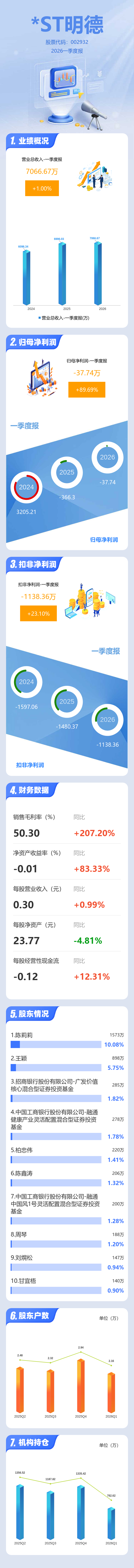 证券之星消息,*ST明德2026年一季报显示,一季度公司主营收入7066.67万元,同比上升1.01%;归母净利润-37.74万元,同比上升89.7%;扣非净利润-1138.36万元,同比上升23.1%;负债率5.78%,投资收益1561.74万元,财务费用166.69万元,毛利率50.3%。